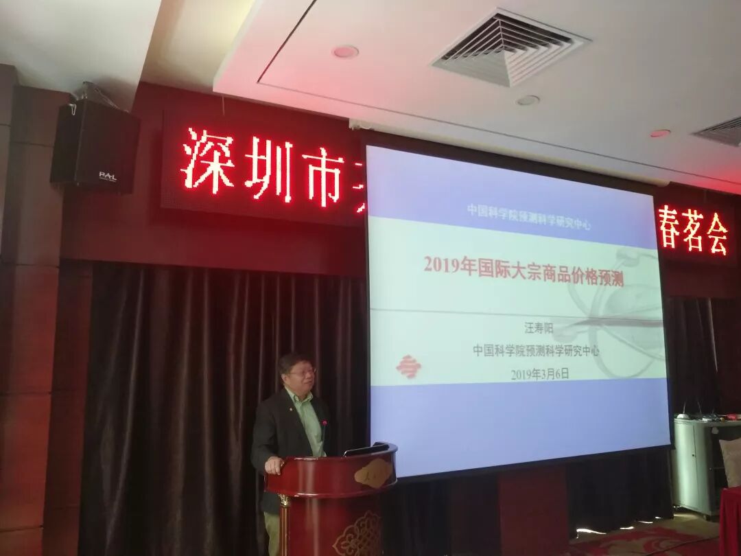 会议第一项议程,由汪寿阳院士作《2019年中国经济分析与预测》和《2019年国际大宗商品价格预测》两项报告。对于2019年中国经济的总体形势,汪寿阳院士分别从“GDP增速”、“投资、消费、进出口”、“国内物价”、“房地产行业走势”、“粮食、棉花、油料生产形势”五大方面进行分析和预测。在报告过程中,汪寿阳院士引用来自中国科学院统计的权威数据,预测在中长期内,中国经济增长速度将呈波浪形下降趋势,中国经济运行、国际经济形势及中国外需增长均将面临更大不确定性。因此,展望2019年,在以习近平同志为核心的党中央坚强领导和十九大精神指引下,我国政府将继续坚持“稳中求进”的总基调。对于国际经济形势,汪院士着重对2019年国际大宗商品价格进行了分析与预测,通过回顾2018年原油、铜和部分农产品的价格,得出了2019年大宗商品价格的三点预测:一是预计2019年全球经济增速下滑使得国际大宗商品价格承压;二是2019年全球货币政策收紧速度有望放缓,刺激大宗商品价格短期反弹;三是2019年国际大宗商品市场供给将较为充裕,但是部分品种供给面临威胁。