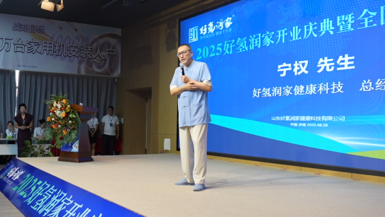 开业庆典在悠扬欢快的乐曲声中正式拉开帷幕。好氢润家创始人宁权率先登台,发表热情洋溢的欢迎辞。他再次强调了好氢润家依托母体公司优势,专注健康饮水科技创新,致力于推广健康水文化的企业使命与愿景。