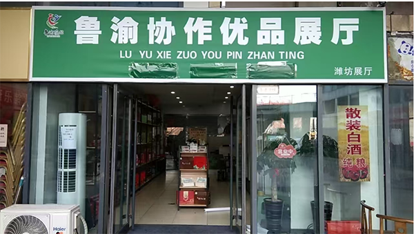 山东潍坊展厅位于山东潍坊的鲁渝协作优品展厅已正式运营,面积180平方米。主要展销重庆特色农产品,包括香肠、腊肉、鸡蛋、剁椒木瓜丝、红糖、葛根粉、茶叶等。
