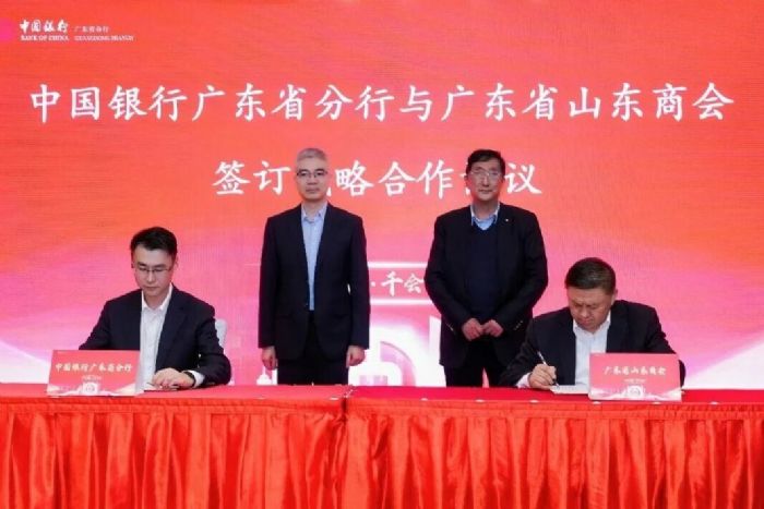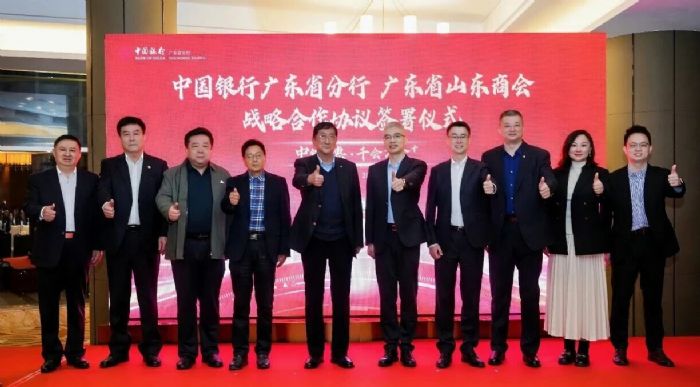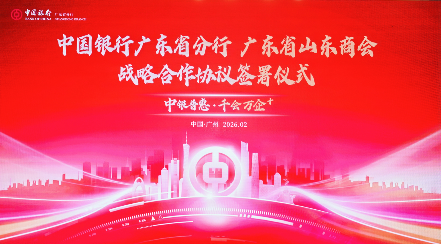 2026年2月7日,“中银普惠·千会万企+”中国银行广东省分行与广东省山东商会战略合作协议签署仪式在广州圣丰索菲特酒店隆重举行。山东省人民政府驻广州办事处主任毕泗亮、经济联络处处长刘晓静、办公室副主任、二级调研员赵燕;广东省山东商会会长江南,监事长李建国,秘书长周慎坤,党支部书记刘娜,以及常务副会长、副会长、理事等85位核心成员出席仪式。中国银行广东省分行党委委员、副行长夏立宏,普惠金融事业部总经理许浩,广州海珠支行党委书记、行长吴刚等金融界嘉宾应邀出席仪式。